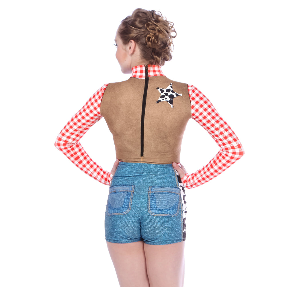 This Way Out West biketard is perfect for the rodeo or some good ol' fashioned line dancing. From red and white gingham print, classic blue denim, cow print, to the leather vest. This cowgirl is ready to saddle up and put on a good shot from the audience. Full front lining and zip center back closure. Perfect for any country/western costuming needs, themed dance performance, or Halloween! Made in the USA. Polyester, Spandex. Cowboy hat not included.