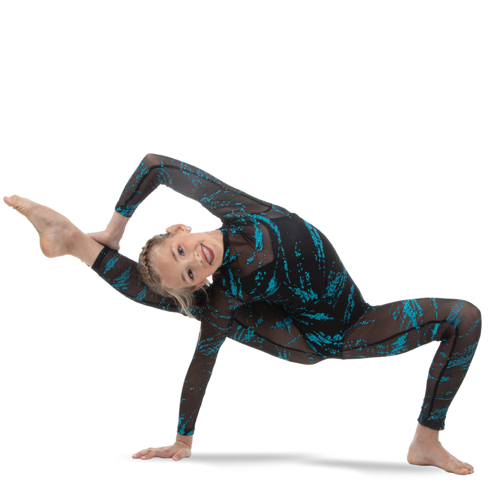 Take your routine to the next level in this stretch mesh unitard. This unique mock neck, long sleeve unitard is designed on power stretch mesh for ultimate mobility and is accented with a shimmer glitter turquoise pattern. This unitard is versatile, as you can wear it with the color of your choosing in a biketard, leotard, or bra and brief combo. Center back zipper.