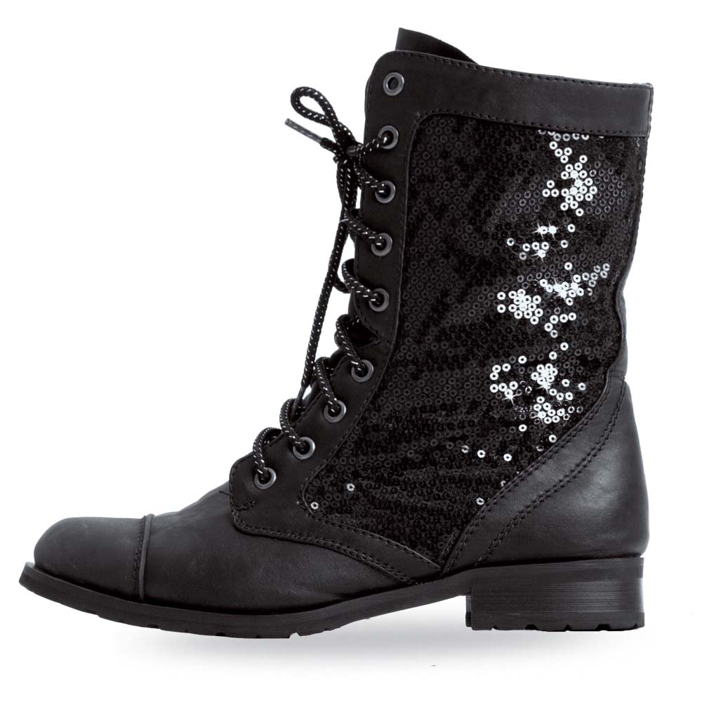 The original Combat Boots with a twist. With its durable and real sequin side panels, KOMBAT is the hottest dance boot in the industry. The toe guards prevent chaffing and they are lightweight, and have a flexible sole. Combat Boots are perfect for the stage, yet are also an all-around versatile boot for every day styling. Synthetic leather. Youth sizing order 1 to 2 sizes larger than street shoe. COMBAT BOOTS soles don't scuff floors, allowing for performance on any type of floor.