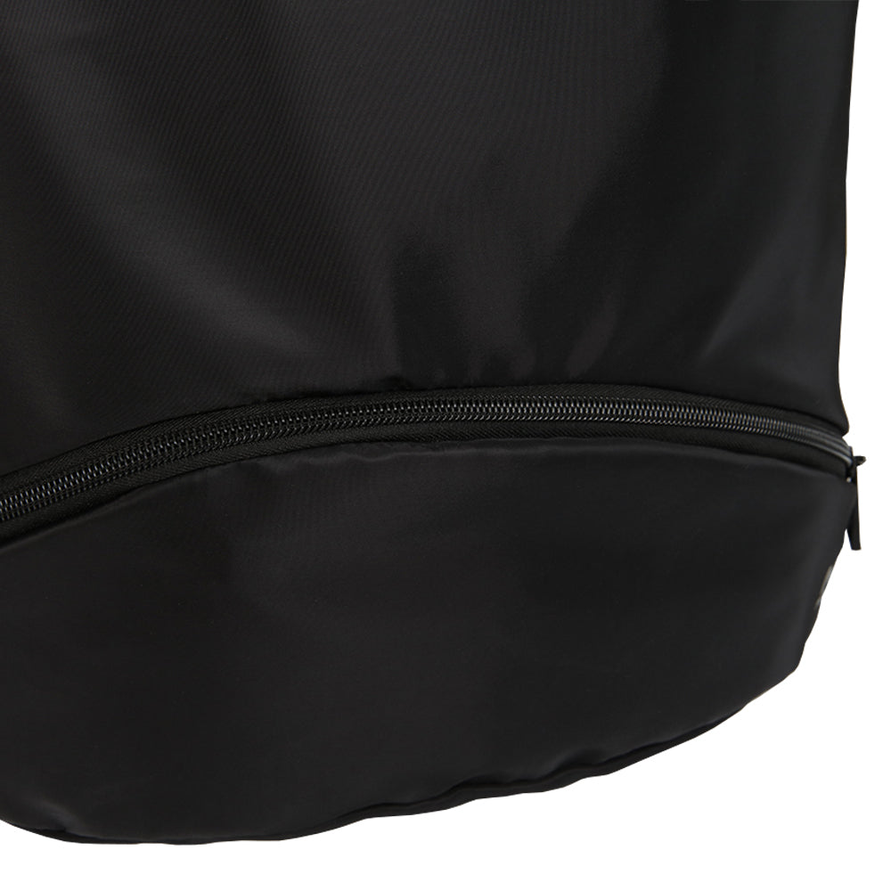 This athletic cinch backpack includes an adjustable cinch top opening with adjustable web shoulder straps. The lower portion includes an additional zippered pocket with a generous pocket bag for organization. Made from a durable coated polyester fabric that is easy to clean and wipe away. Reinforced side seams and bottom.
