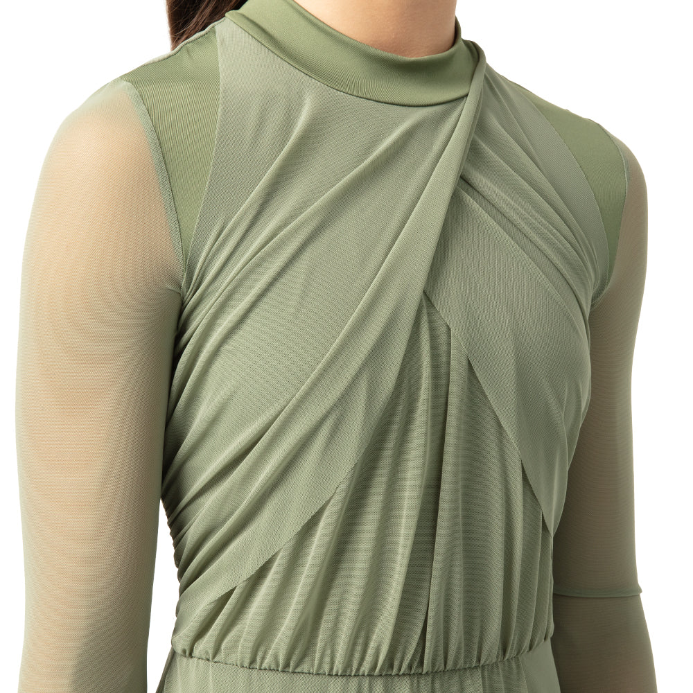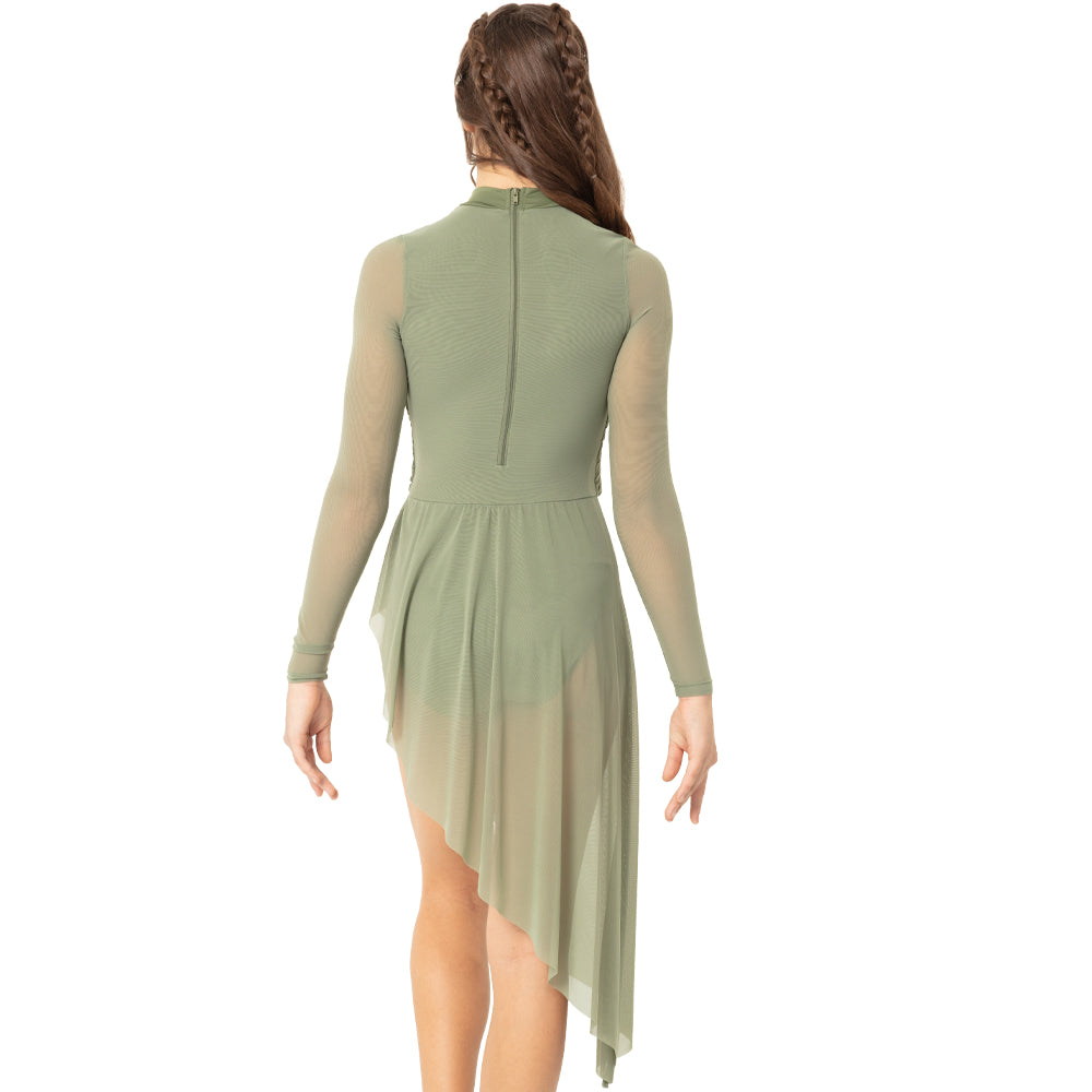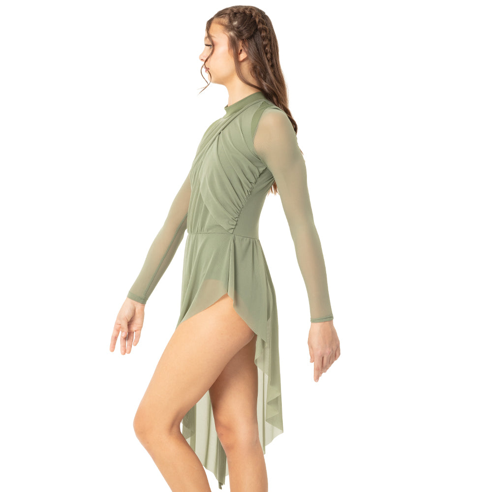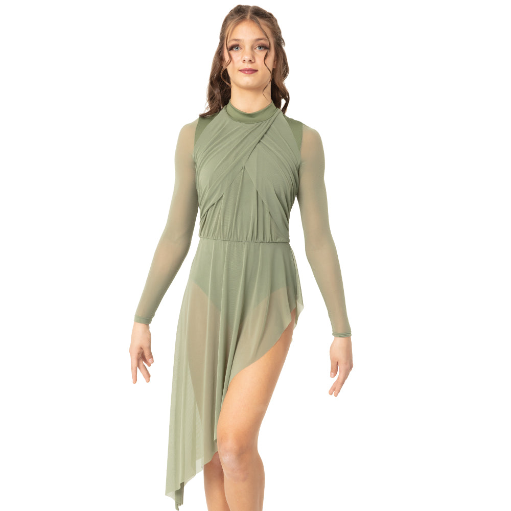 This long mesh sleeve lyrical dress includes draped and gathered crisscross mesh panels on the bodice. Asymmetrical midi length mesh skirt and full coverage back. Foundation tricot leotard with center back zipper closure and mock neckband.