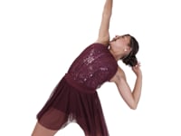 Sparkling biketard featuring a high neck sequin tricot bodice with a keyhole, a gathered overlay mesh panel. Sequin tricot back bodice with keyhole and g-hook closure. Binding around armhole and neckline for comfort. Nylon, Spandex.