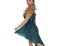Free flowing dress includes a criss cross gathered front panels with a gorgeous cascading ruffle along the front and back neckline, and a gathered asymmetrical high low hemline skirt. Leotard attached. Front and back bodice is fully lined with tan tricot and teal mesh overlay for coverage. Polyester, Spandex.