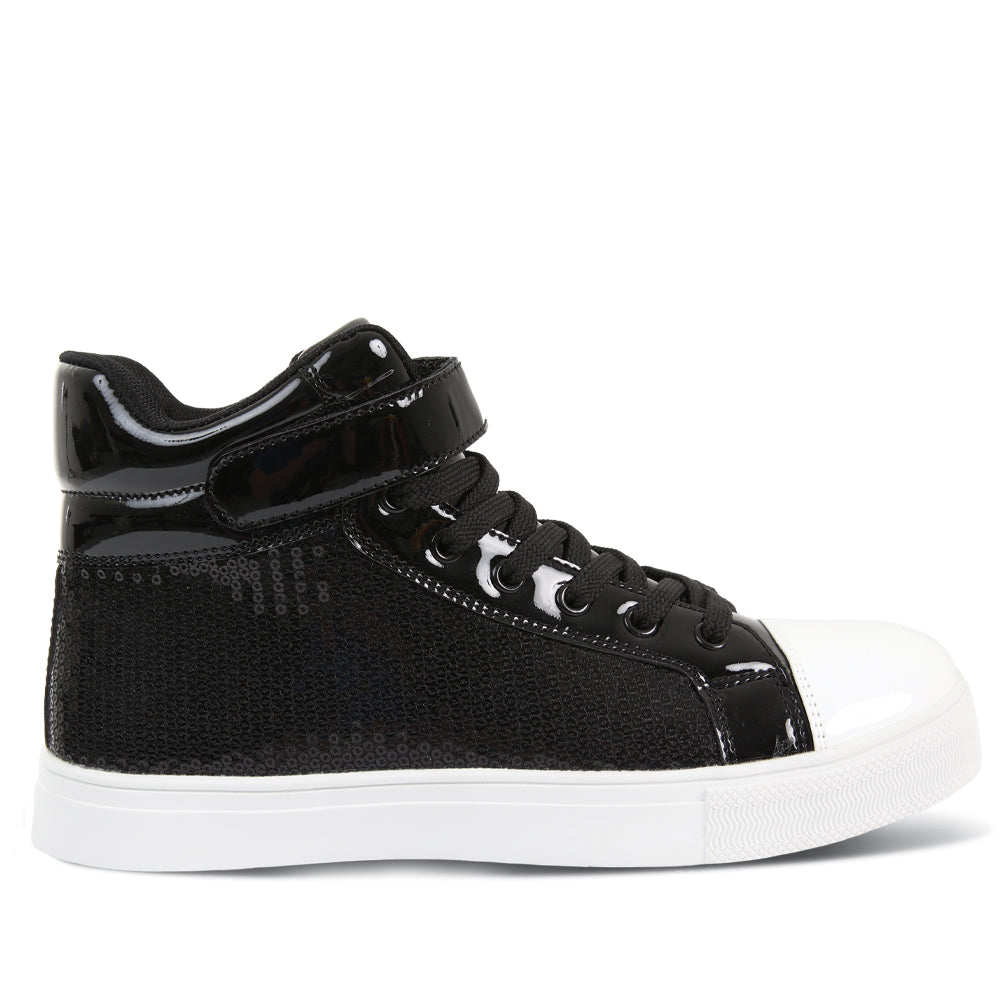 With a mix of sequins and a glossy upper, the Alexandra Hip Hop shoes are a for sure performance show stopper. Glossy white cap toe with a white durable rubber sole. Mid-top structure with a plush mid-sole cushioning. Lightweight shoe also features a lace up front with a velcro strap closure. We recommend ordering the same size as your street shoe size. Whole sizes only.