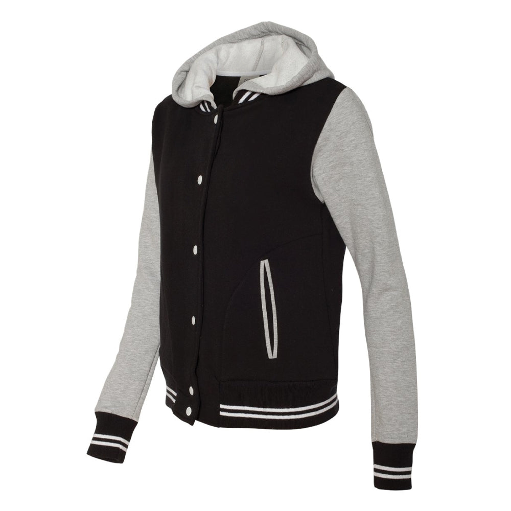 Snap front closure Youth Varsity Jacket. Contrast sleeves and unlined hood with flat woven drawcord. Striped knit cuffs and waistband.<br><br>*This product runs Two sizes smaller than standard MoveU sizing. Please order Two sizes up.*